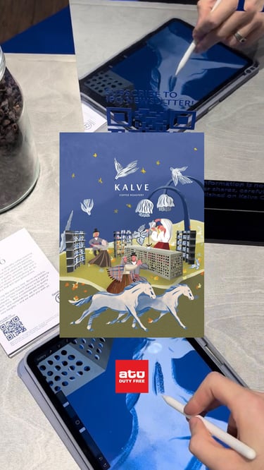 In September 2024, Riga Airport’s duty-free zone welcomed local brands, offering them a unique opportunity to present their products to travelers. Kalve Coffee Roasters, a prominent Latvian coffee brand, was featured for the month, and I had the privilege to collaborate with both Kalve and Duty Free to bring my creative vision to life.