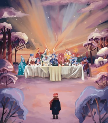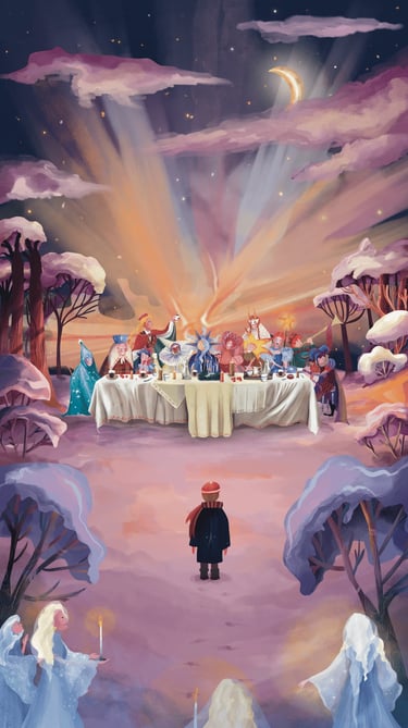 The illustration, “Pathway to the Light,” tells a heartfelt story. It depicts 12 unique spirits gathered around a table in a peaceful winter forest. Despite the cold and December winds, they are undisturbed, sharing warmth, love, and stories—each moment accompanied by a cup of Kalve Coffee.
