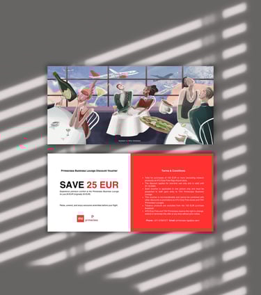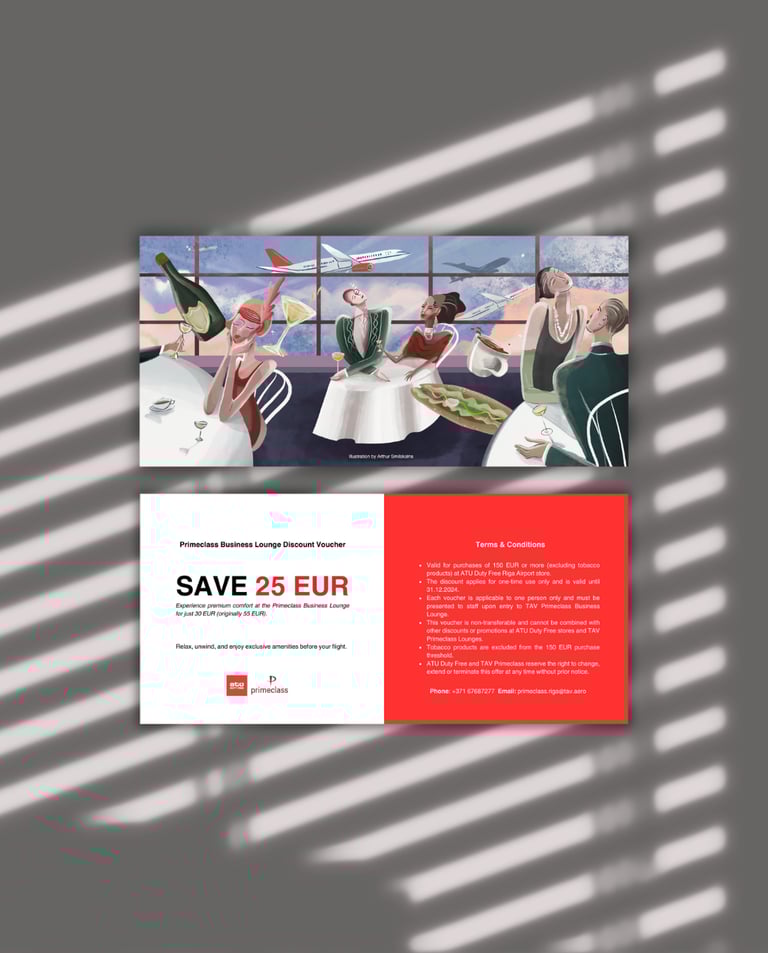 I created a custom Gatsby-inspired illustration for a special voucher in collaboration with TAV Prime Class and ATU Duty Free Riga. Available in December 2024, this exclusive voucher offered travelers at Riga Airport access to the premium Prime Class lounge. The design reflects the relaxed and luxurious atmosphere that guests could enjoy while waiting for their flights. Drawing inspiration from the elegance and sophistication of 1920s Western fashion, I aimed to create a sense of timeless refinement, perfectly complementing the high-end experience provided by Prime Class.